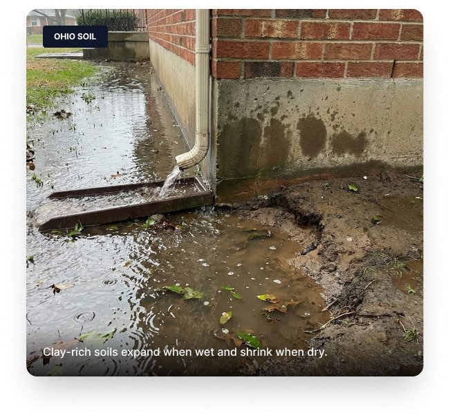 Ohio’s clay-rich soils create immense pressure against foundation walls. Combined with heavy rainfall and drainage issues, this leads to cracking, bowing, and foundation settlement.